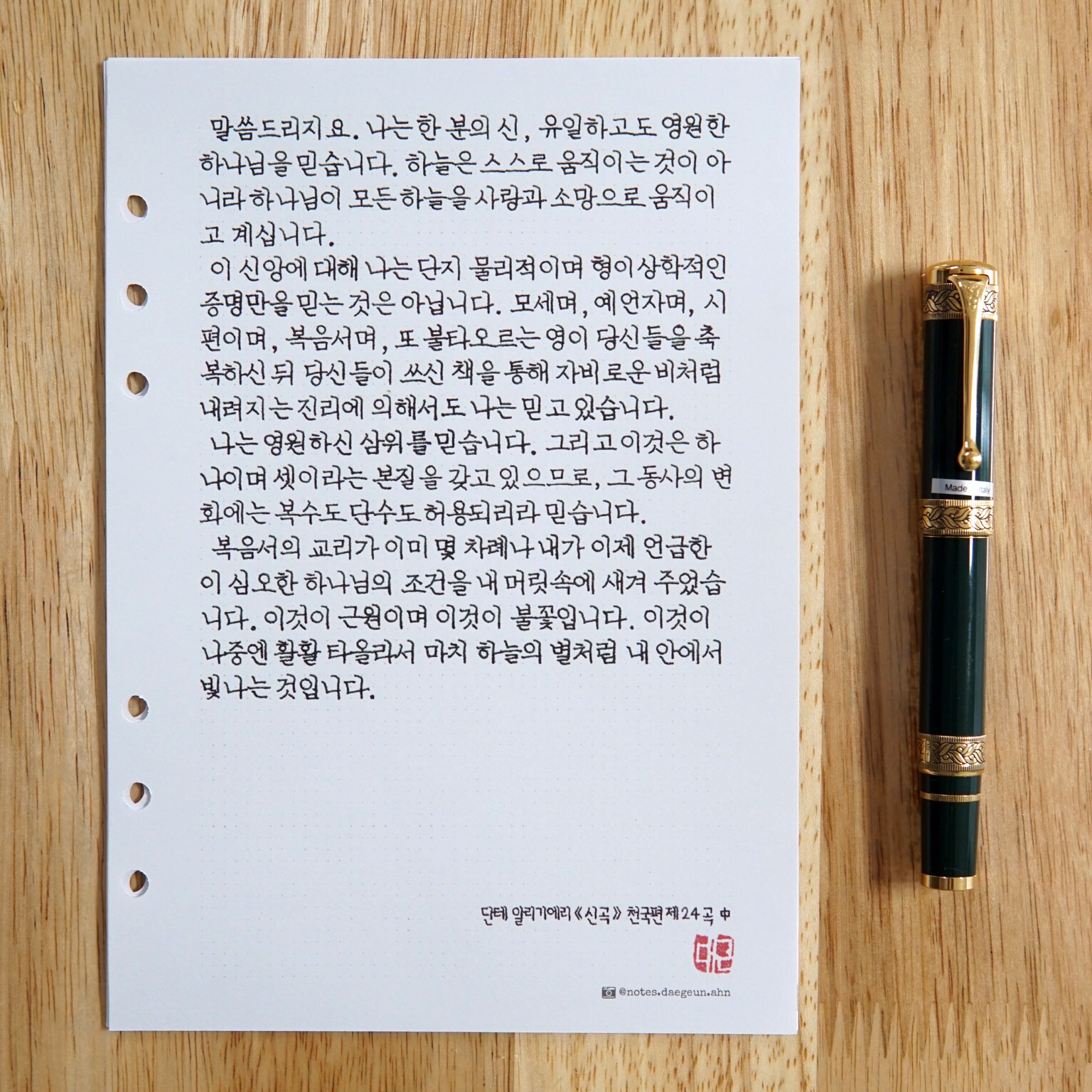 말씀드리지요. 나는 한 분의 신, 유일하고도 영원한 하나님을 믿습니다. 하늘은 스스로 움직이는 것이 아니라 하나님이 모든 하늘을 사랑과 소망으로 움직이고 계십니다.